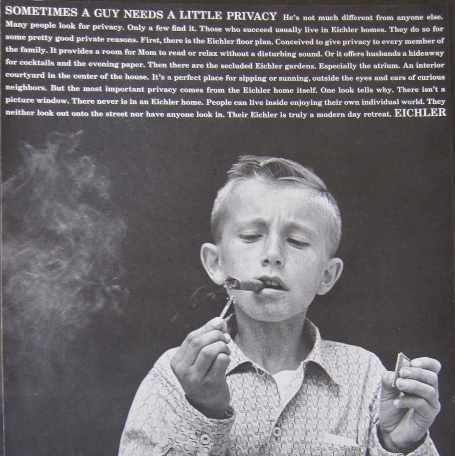 The optimism of the postwar years, in part, paved the way for social change. In 1948, the Supreme Court ruled that racial restrictions written into property deeds were unconstitutional. Locally, in 1954, developer Joseph Eichler sold his first home to African-American buyers in Palo Alto. The next year, he received complaints again, this time from a group of neighbors in San Rafael after a home was sold to an African American family. Eichler responded angrily to their complaints, going “door-to-door personally to confront them and even offered to buy back their homes.” No one took the developer up on his offer, and he soon developed a reputation that he would sell to anyone based solely on their qualifications.