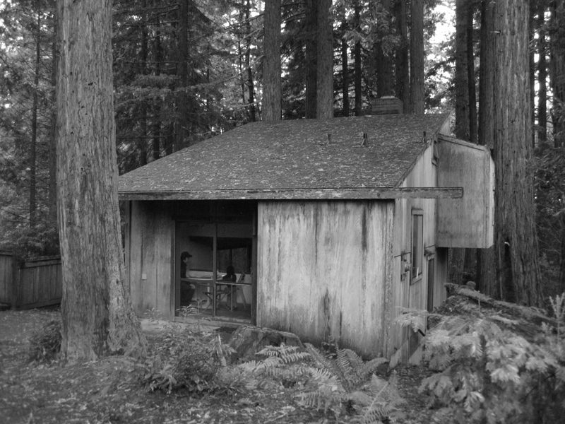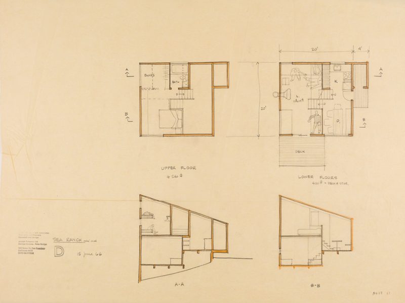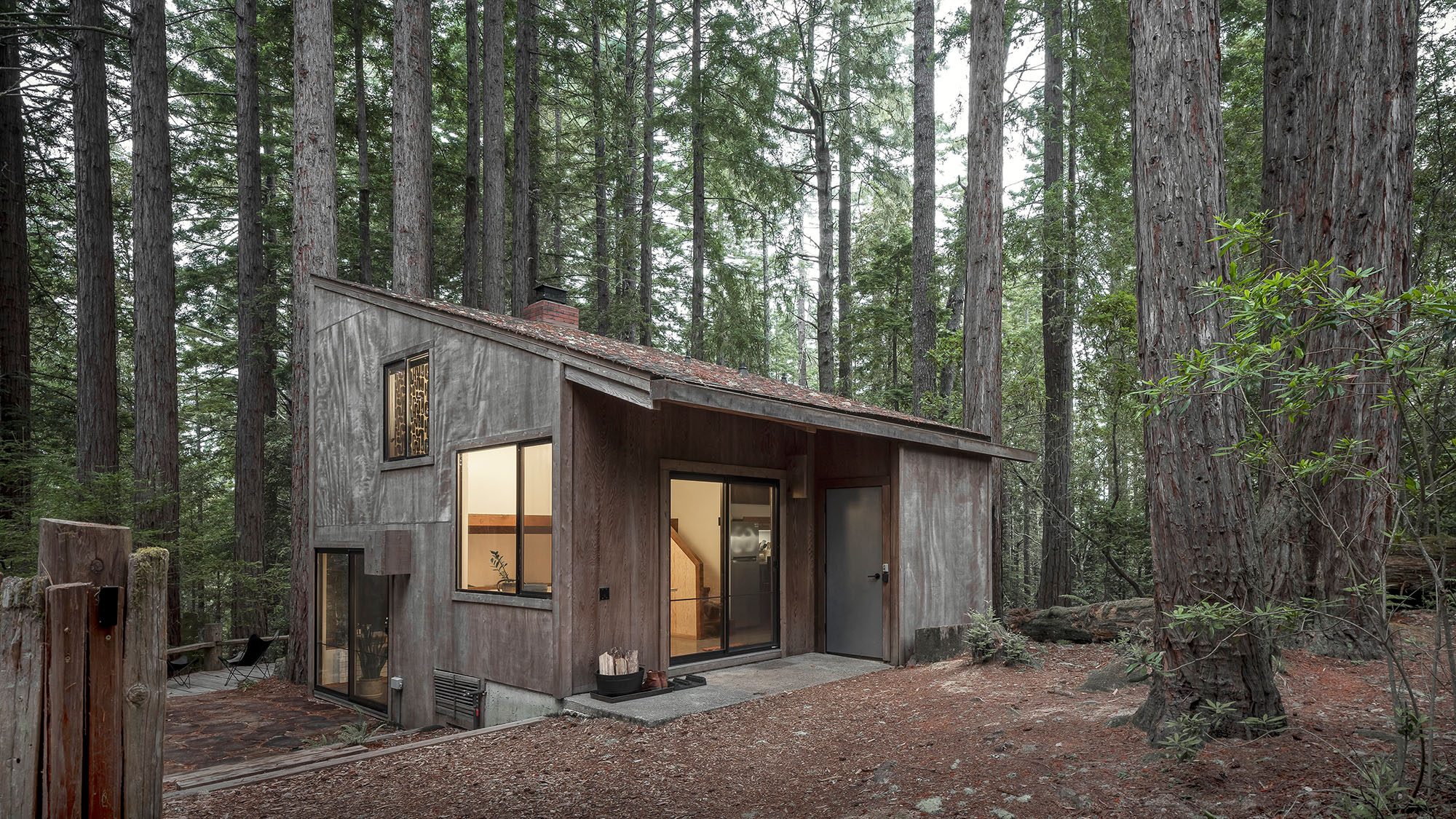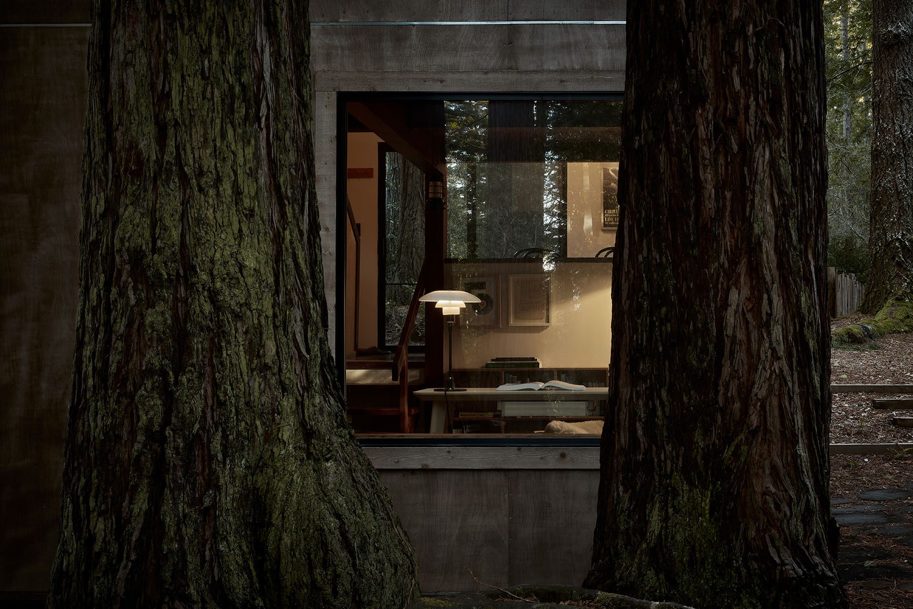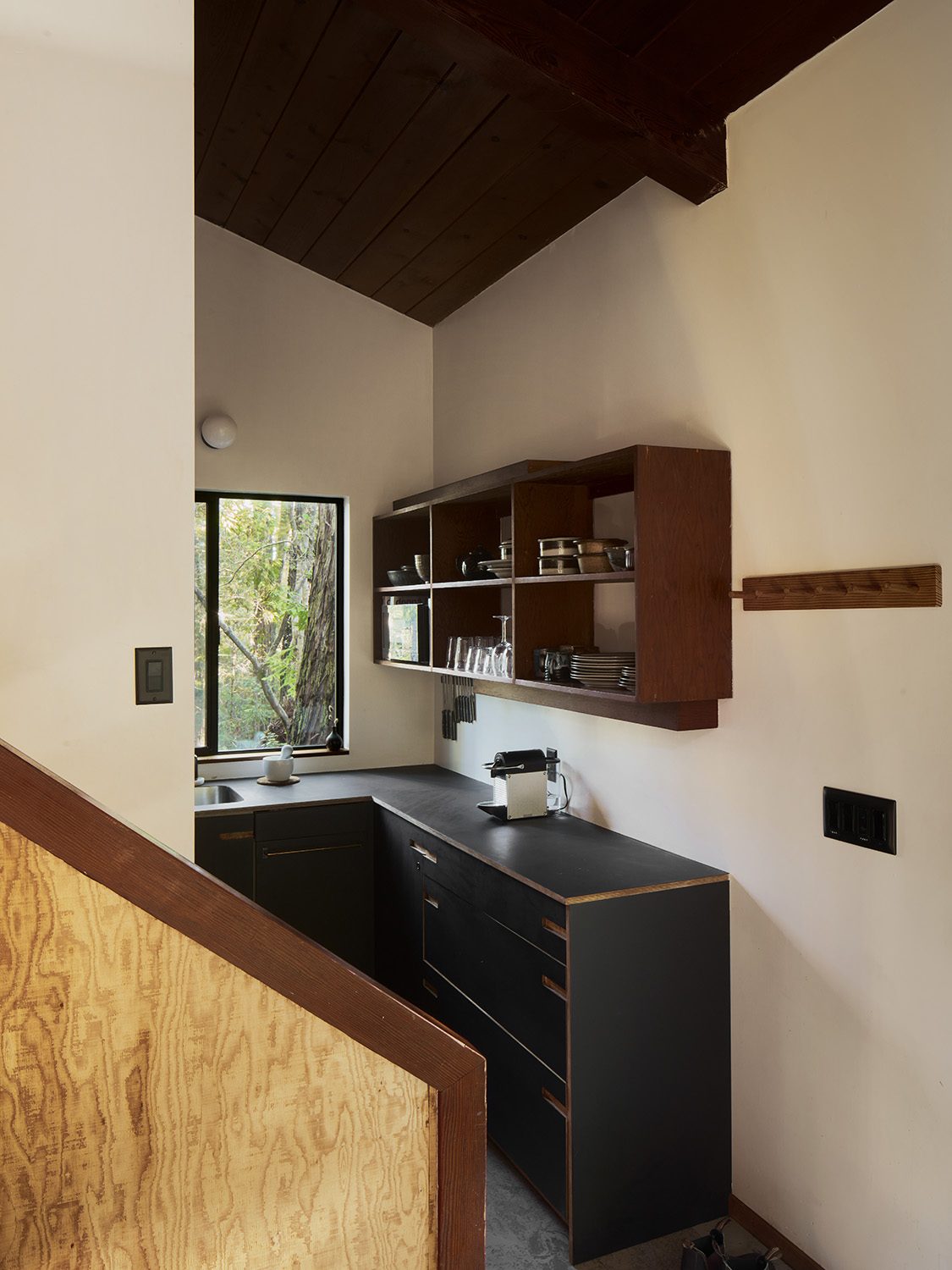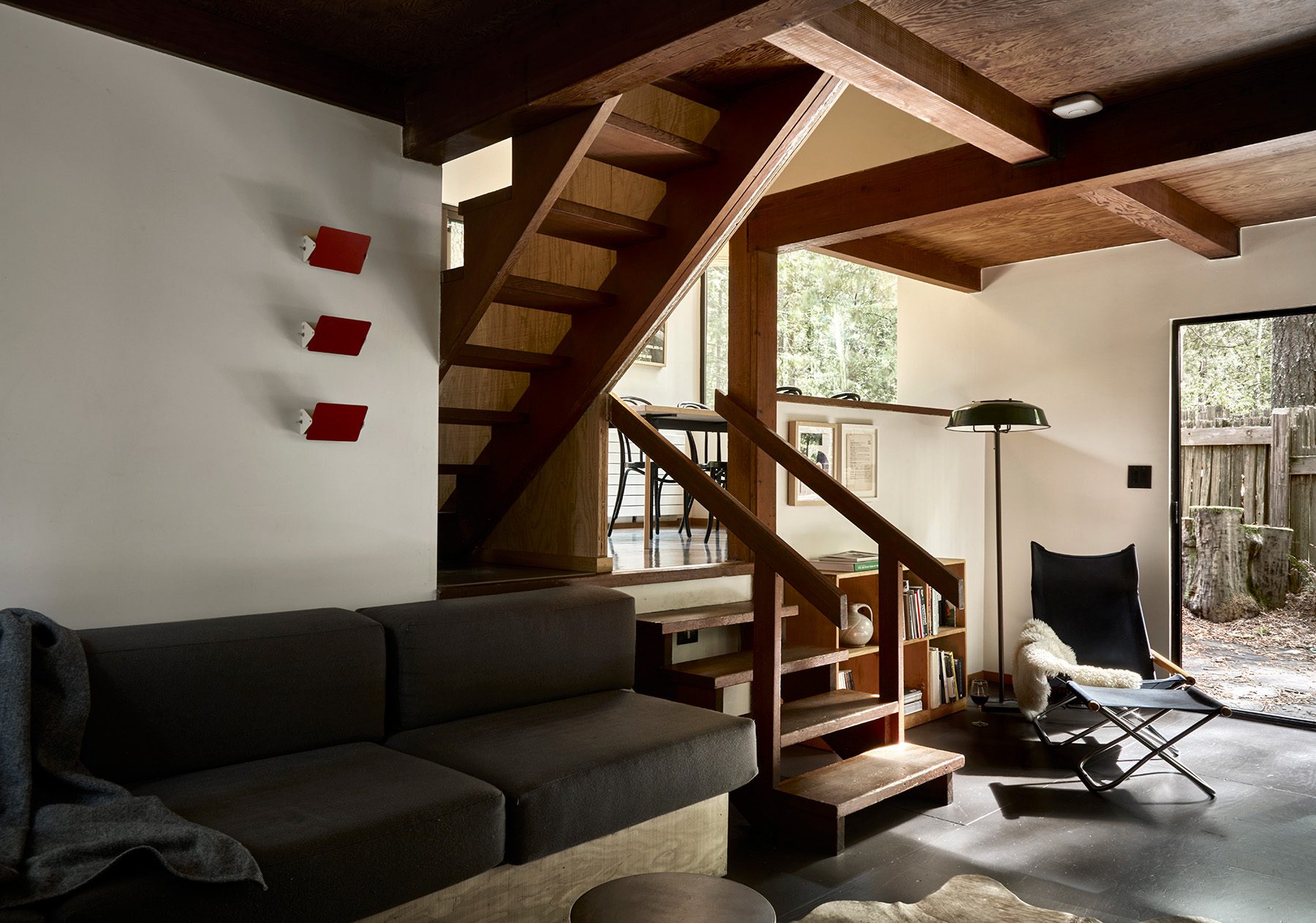 Designed by noted Bay Area architect Joseph Esherick, the home was third in a series of affordable demonstration houses commissioned by the developers of The Sea Ranch, a weekend home community and cultural experiment grounded in 1960s idealism. The home’s current owner, its second since its construction in 1968, sought to restore the home while improving its liveability and performance. George Homsey, Esherick’s partner, consulted on the exterior restoration. New plywood and laminate kitchen cabinets with apartment-size appliances were designed to utilize every inch of space. The original plywood shelving was restored using reclaimed materials from the demolition. A hinged partition gives privacy between the two bedrooms, designed to preserve the original intent of the bedroom level by folding away into the wall when not in use. Large windows connect the interior space to the coastal redwood forest, a towering specimen just outside the workspace window.