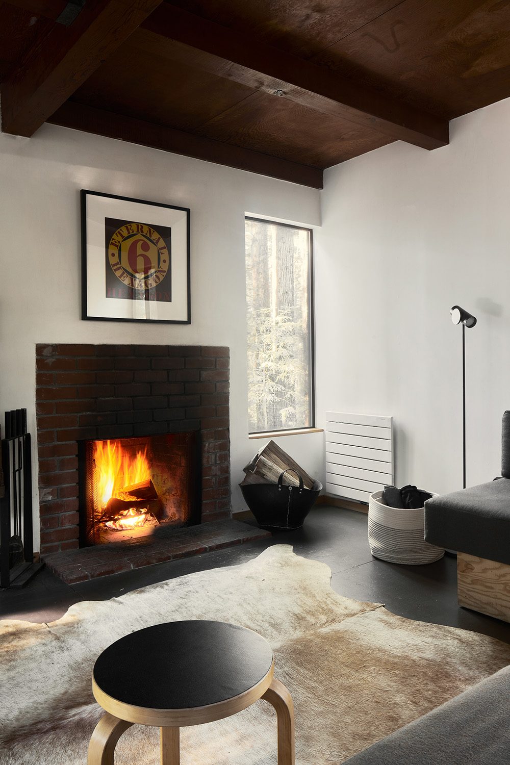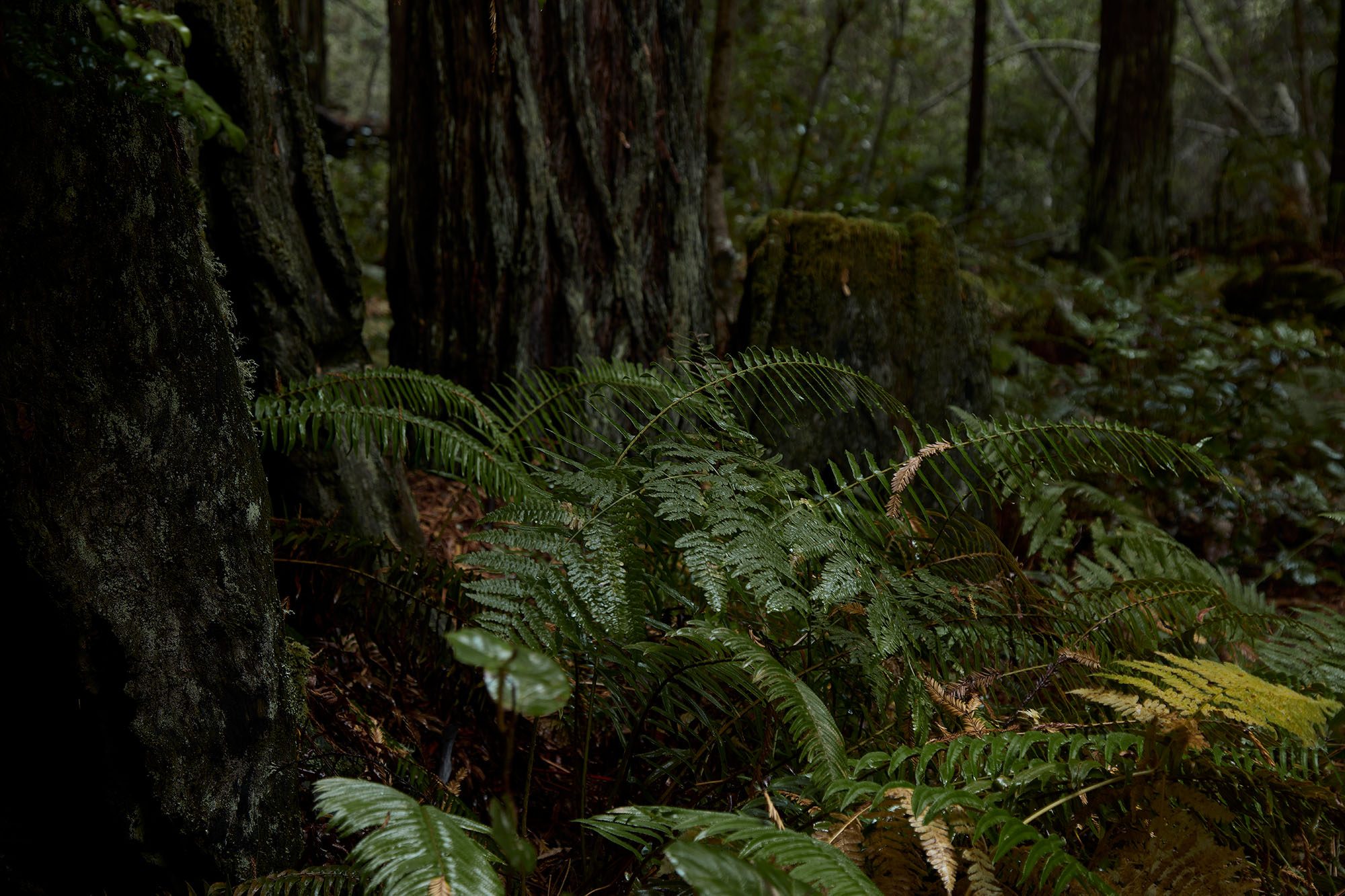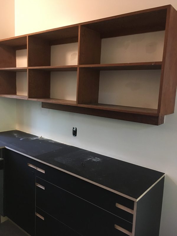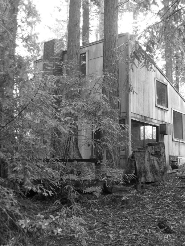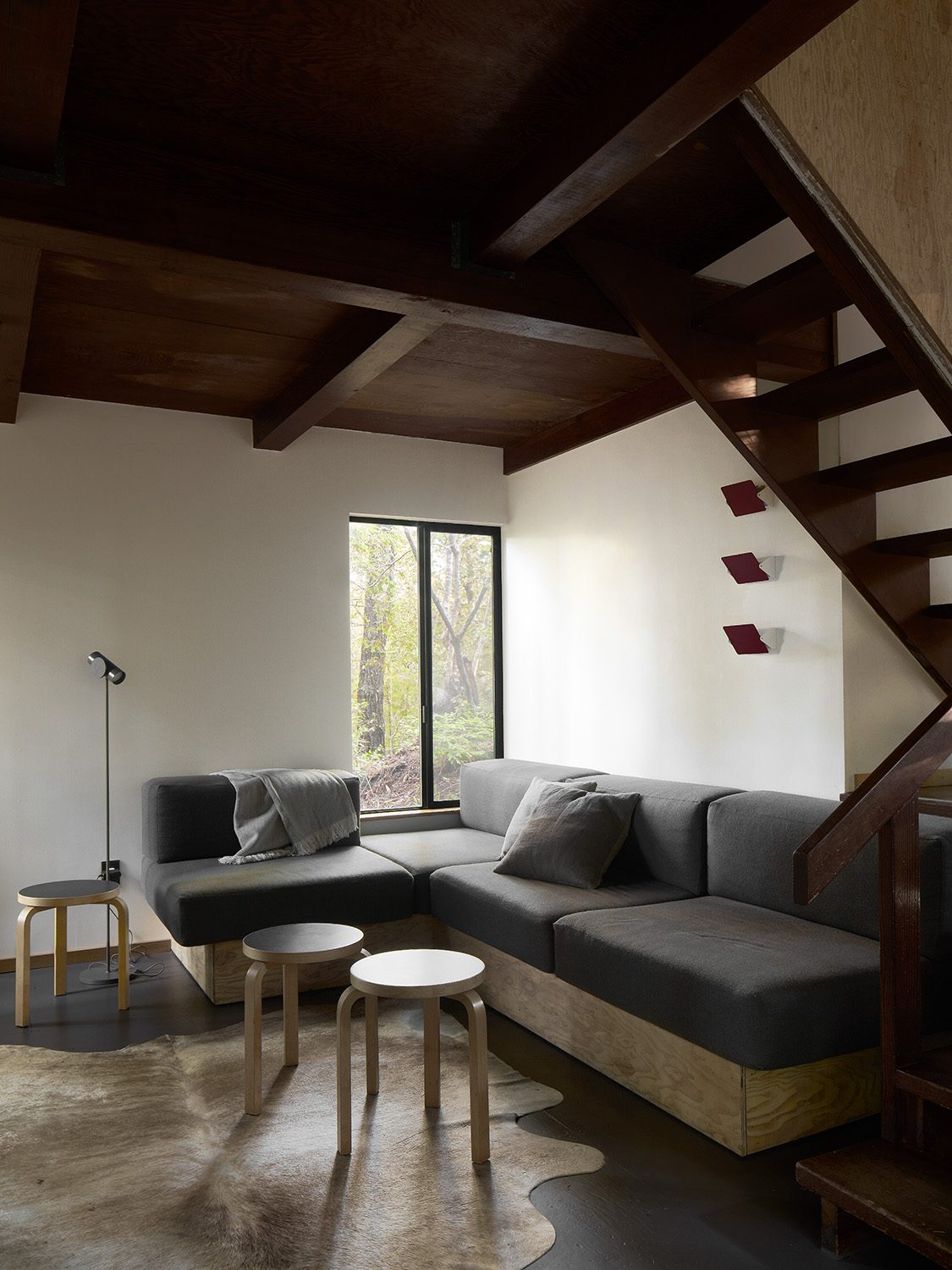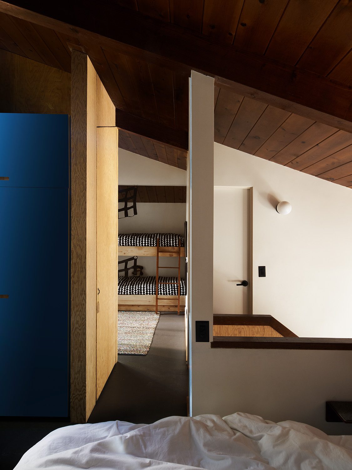 Designed by noted Bay Area architect Joseph Esherick, the home was third in a series of affordable demonstration houses commissioned by the developers of The Sea Ranch, a weekend home community and cultural experiment grounded in 1960s idealism. The home’s current owner, its second since its construction in 1968, sought to restore the home while improving its liveability and performance. George Homsey, Esherick’s partner, consulted on the exterior restoration. New plywood and laminate kitchen cabinets with apartment-size appliances were designed to utilize every inch of space. The original plywood shelving was restored using reclaimed materials from the demolition. A hinged partition gives privacy between the two bedrooms, designed to preserve the original intent of the bedroom level by folding away into the wall when not in use. Large windows connect the interior space to the coastal redwood forest, a towering specimen just outside the workspace window.