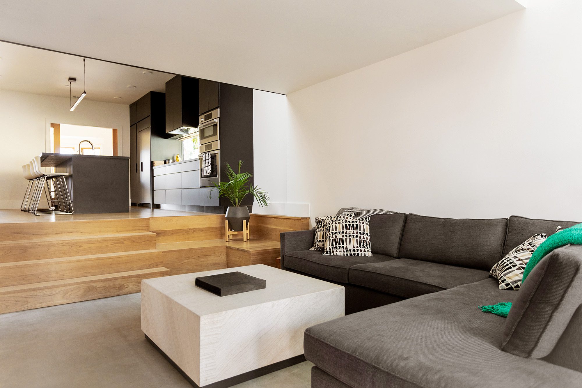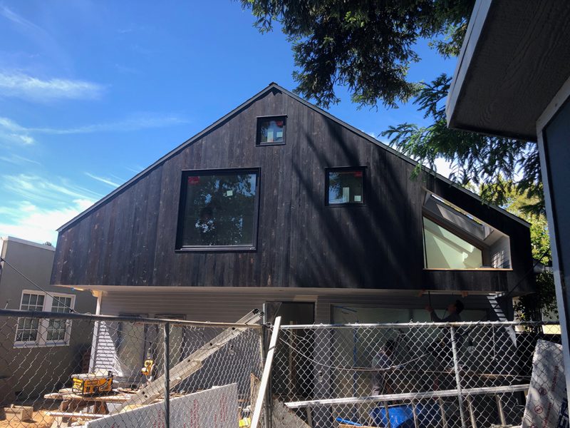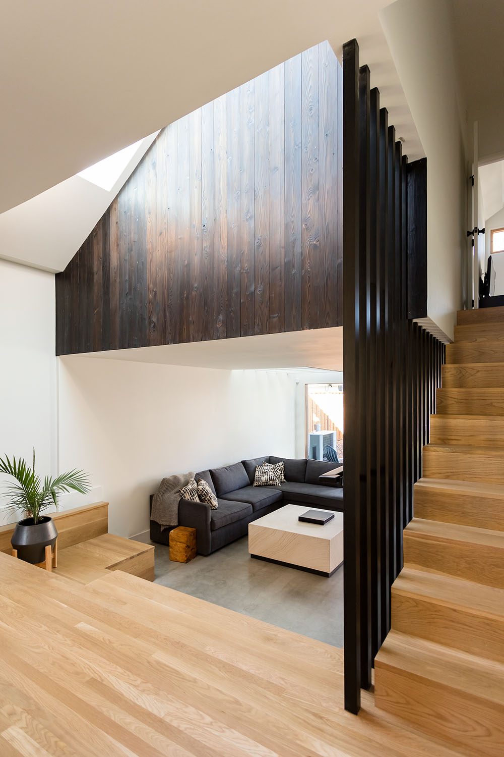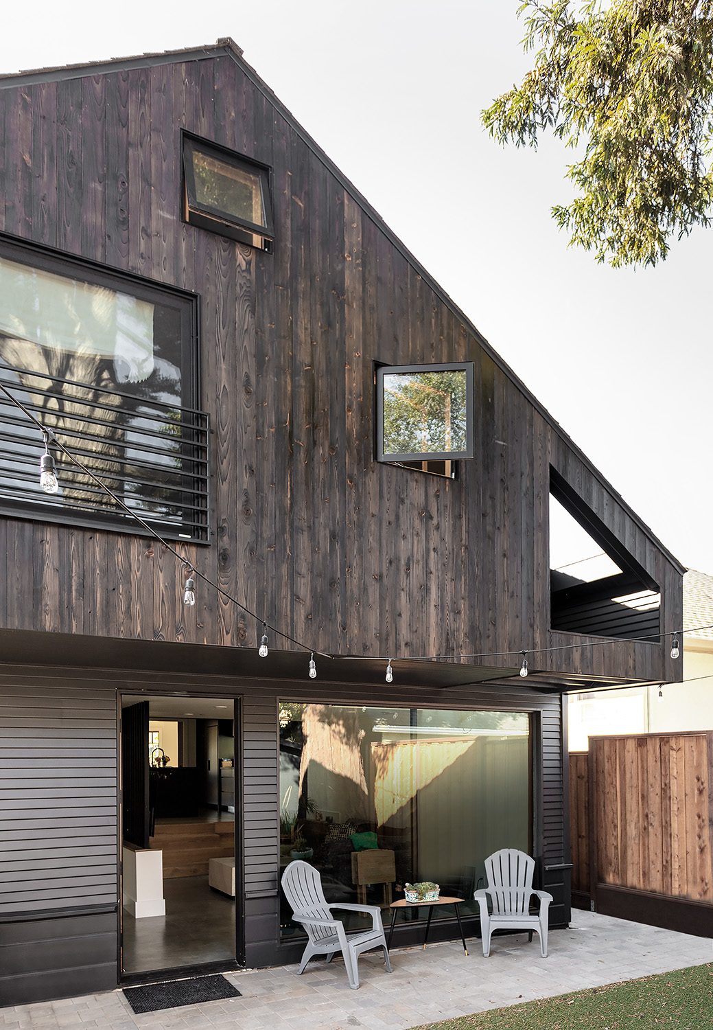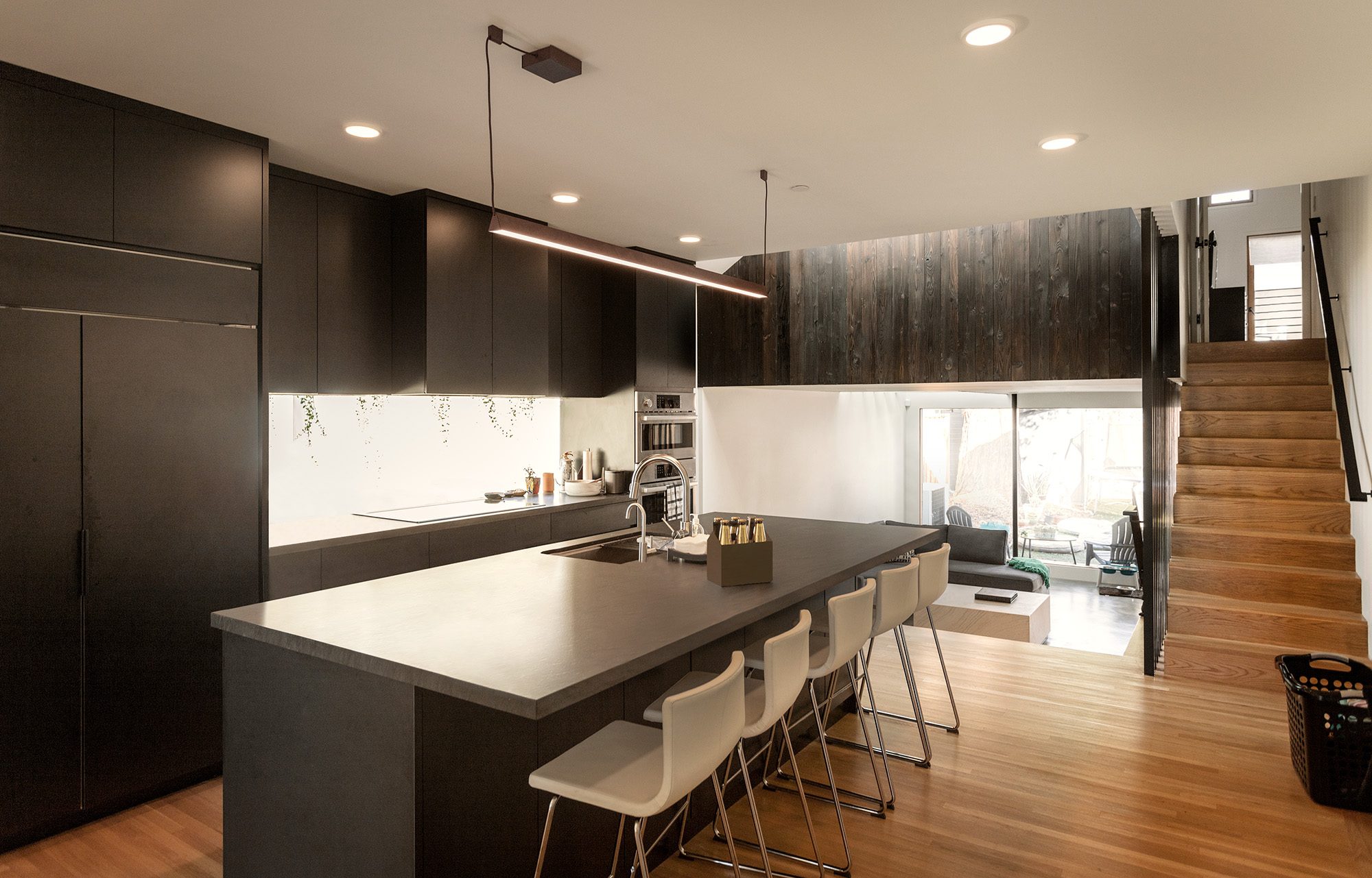 Framestudio transformed a petite two-bedroom cottage from 1912 into a light-filled, multi-level, four-bedroom home for an active family of five. Located in a historic neighborhood with strict regulations that favor pastiche, we brought back authenticity by restoring the bay window and maintaining the roof proportions while allowing for dynamic space and circulation within. The ridgeline of the original hipped roof was extended to form a cantilever volume which contains the second level. Clad in shou sugi ban siding, the addition introduces a modern design language that complements the original historic structure. Stadium-style steps connect the ground level living room with the centrally located kitchen, the hub of family life. Upstairs is the primary suite, with a home office that overlooks the living room through an oversized light well, one of four that adorn the walls with ever-changing light and shadow throughout the day.