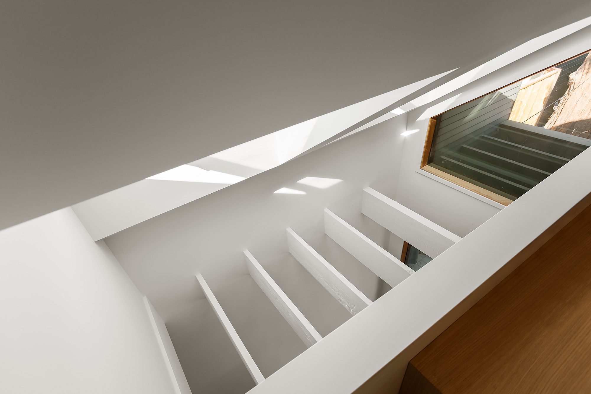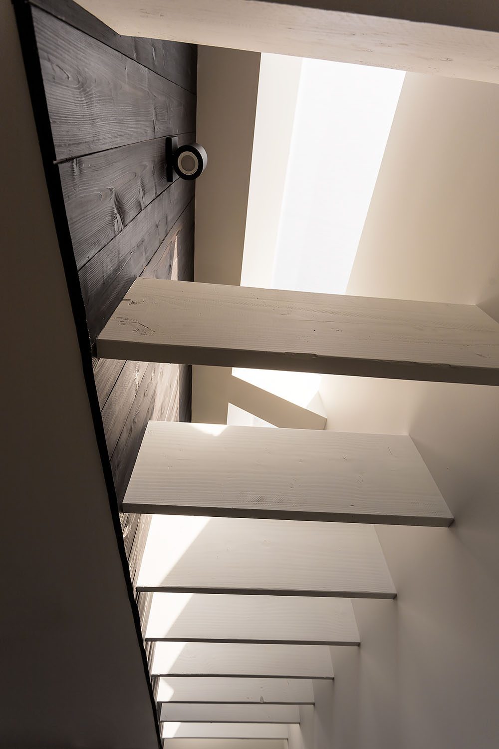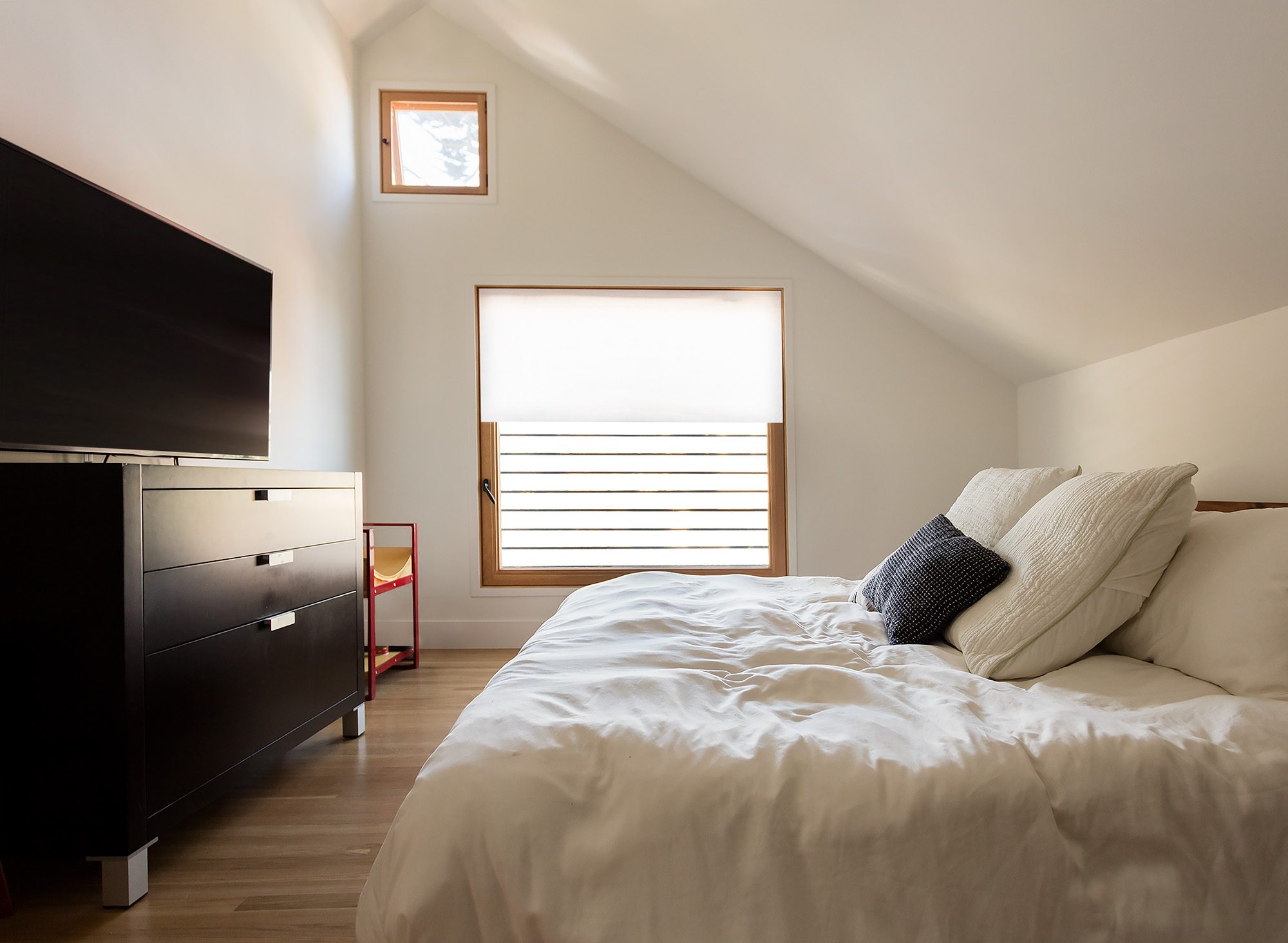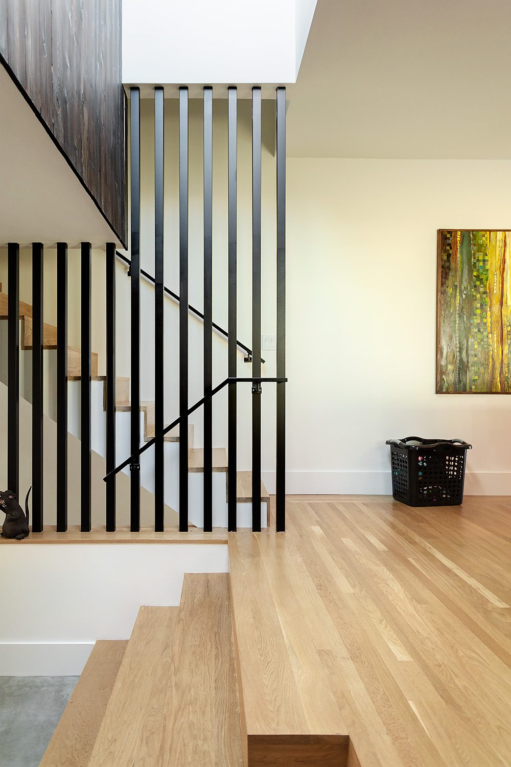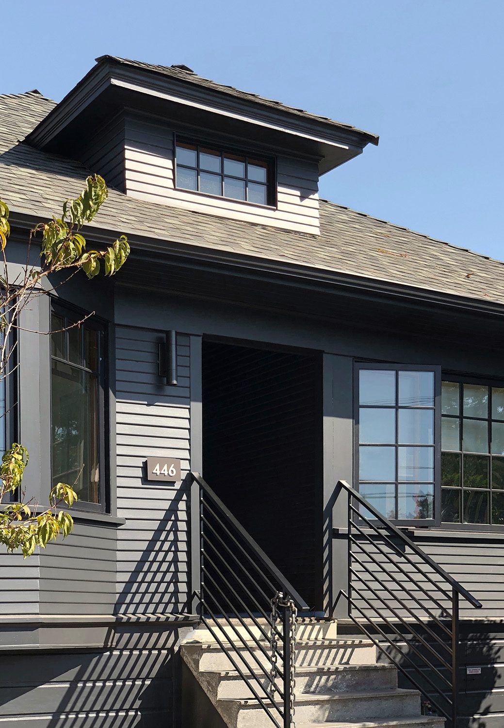 Framestudio transformed a petite two-bedroom cottage from 1912 into a light-filled, multi-level, four-bedroom home for an active family of five. Located in a historic neighborhood with strict regulations that favor pastiche, we brought back authenticity by restoring the bay window and maintaining the roof proportions while allowing for dynamic space and circulation within. The ridgeline of the original hipped roof was extended to form a cantilever volume which contains the second level. Clad in shou sugi ban siding, the addition introduces a modern design language that complements the original historic structure. Stadium-style steps connect the ground level living room with the centrally located kitchen, the hub of family life. Upstairs is the primary suite, with a home office that overlooks the living room through an oversized light well, one of four that adorn the walls with ever-changing light and shadow throughout the day.
