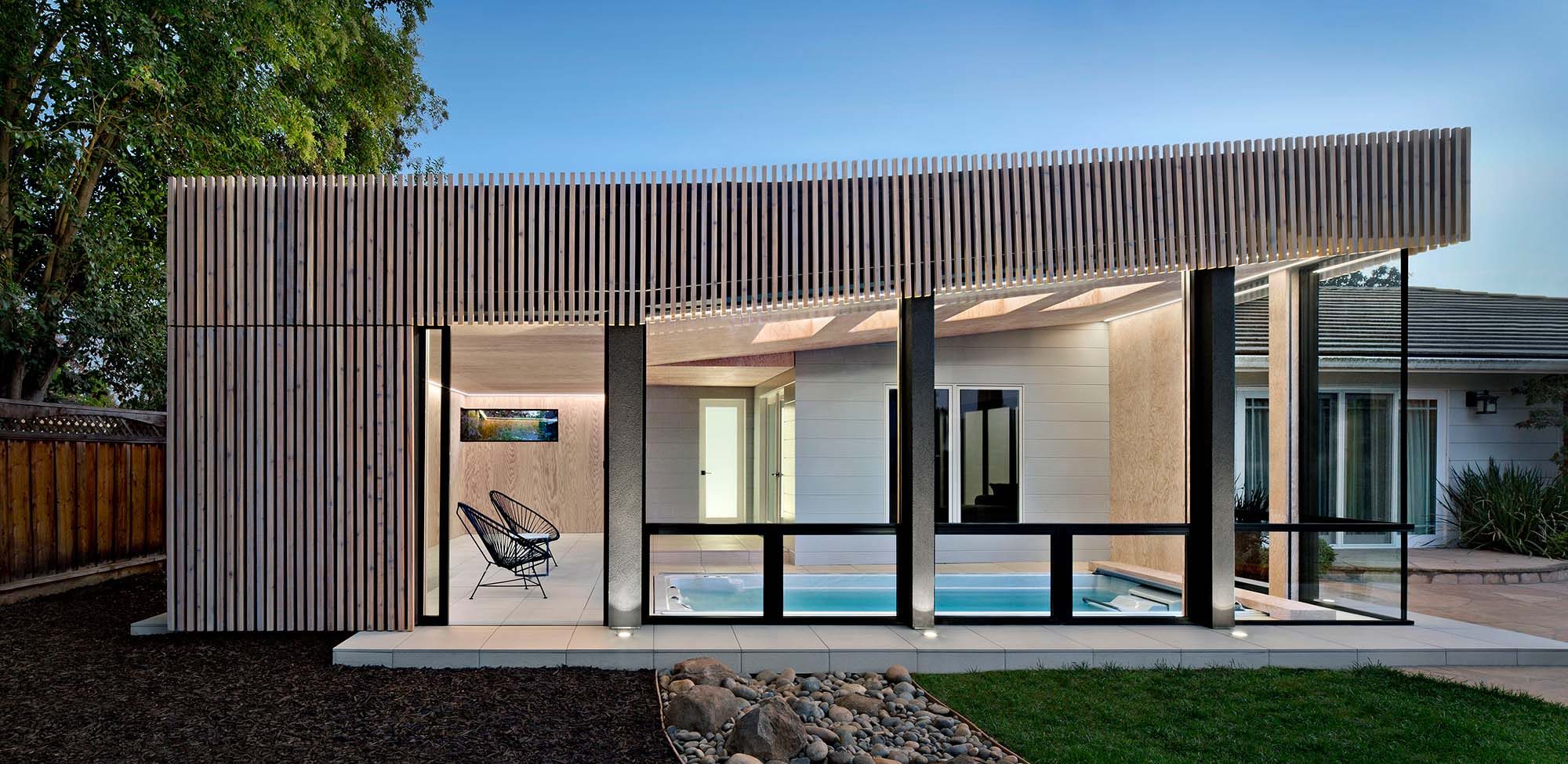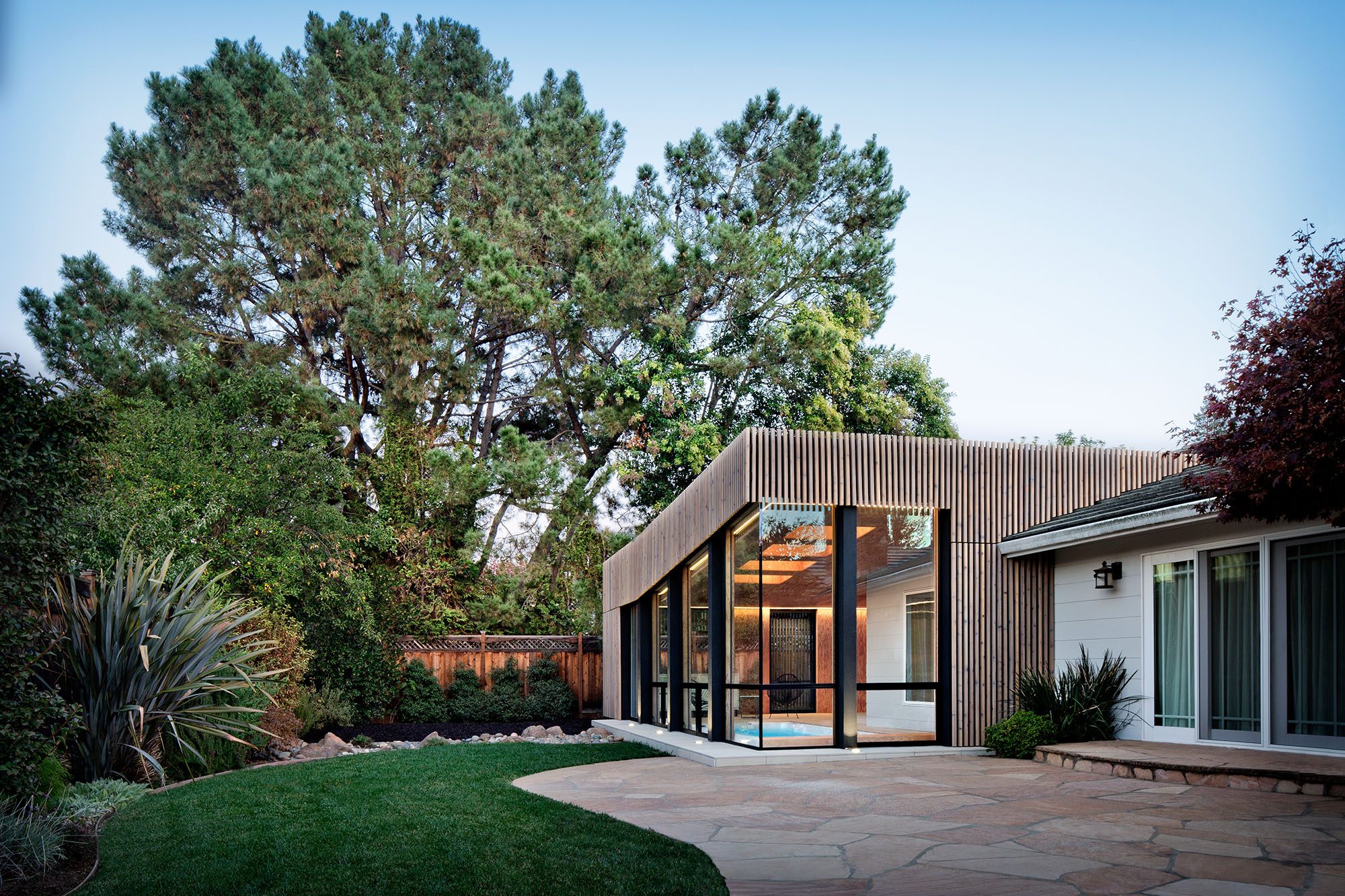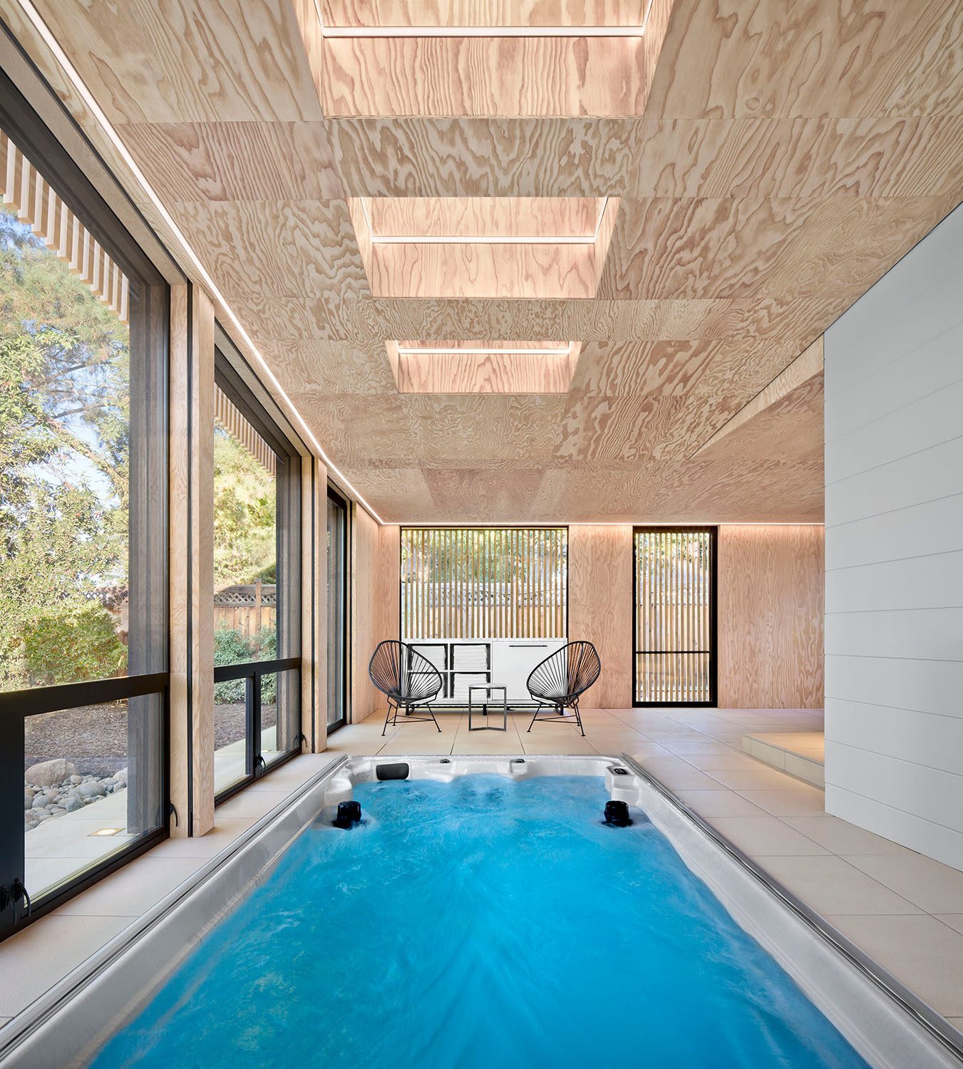 The owners approached Framestudio for an addition to their 1966 ranch-style home that would contain a pool and wellness space, but on one condition: make as few changes to the house and garden as possible. The design concept was inspired by European planning laws that dictate additions to listed historic structures be in the style of the current times, intentionally contrasting with the original. The simple geometry and limited materials give clarity to the new addition. The exterior is punctuated by a cladding of vertical cedar battens, which will age to soft gray over time. Along the neighbor-facing facade, the cladding forms a screen, offering privacy, as well screening out the harsh sun. Plywood animates the interior, creating an energy well-suited for fitness and wellness.