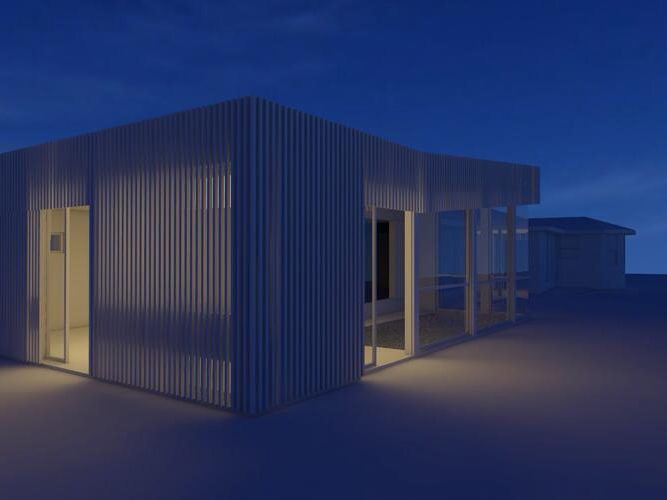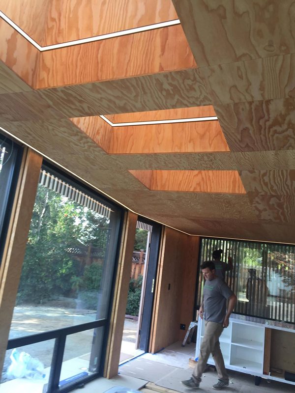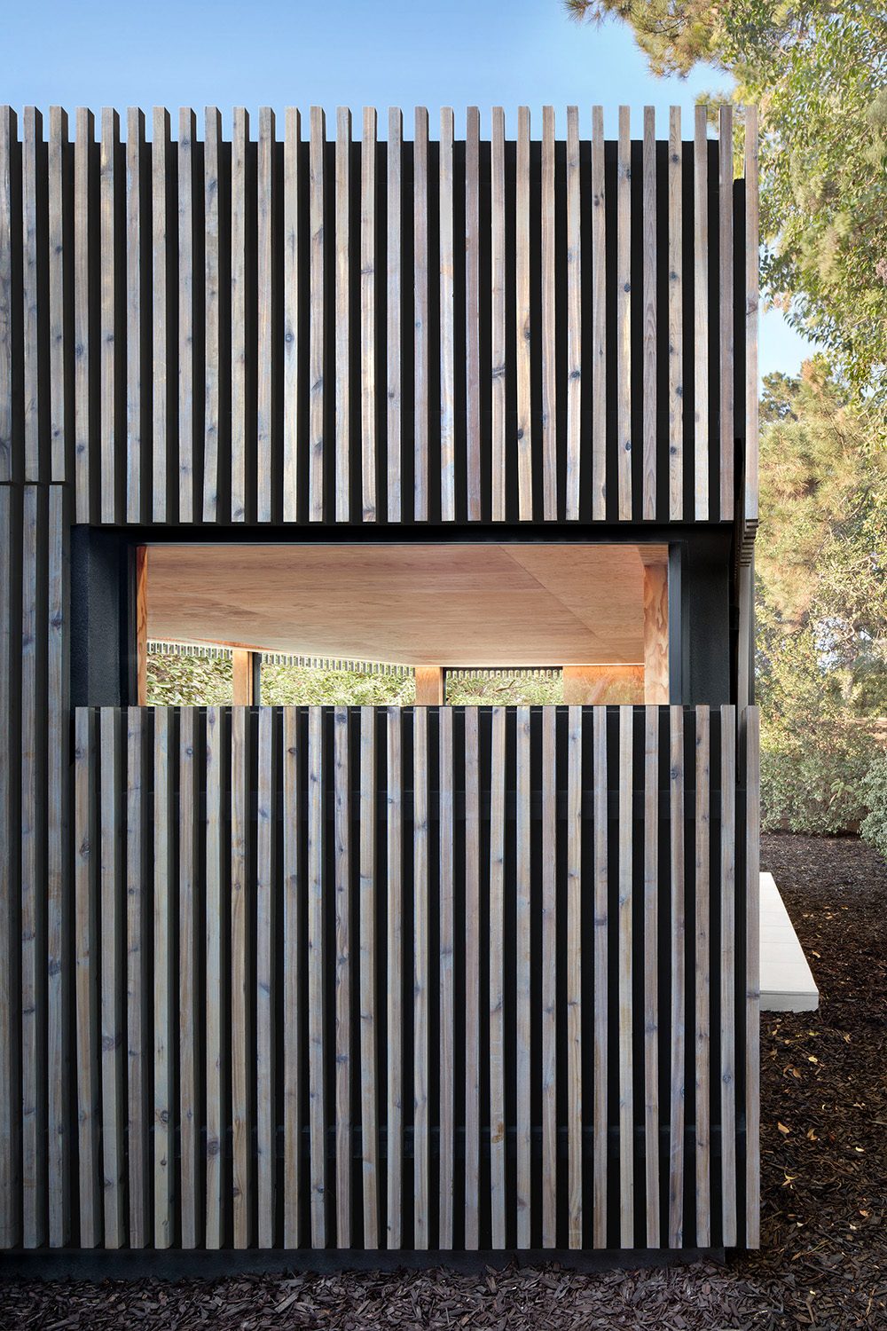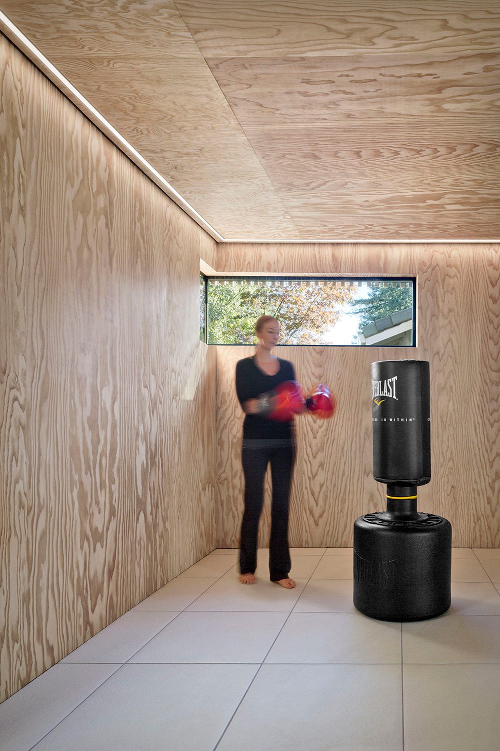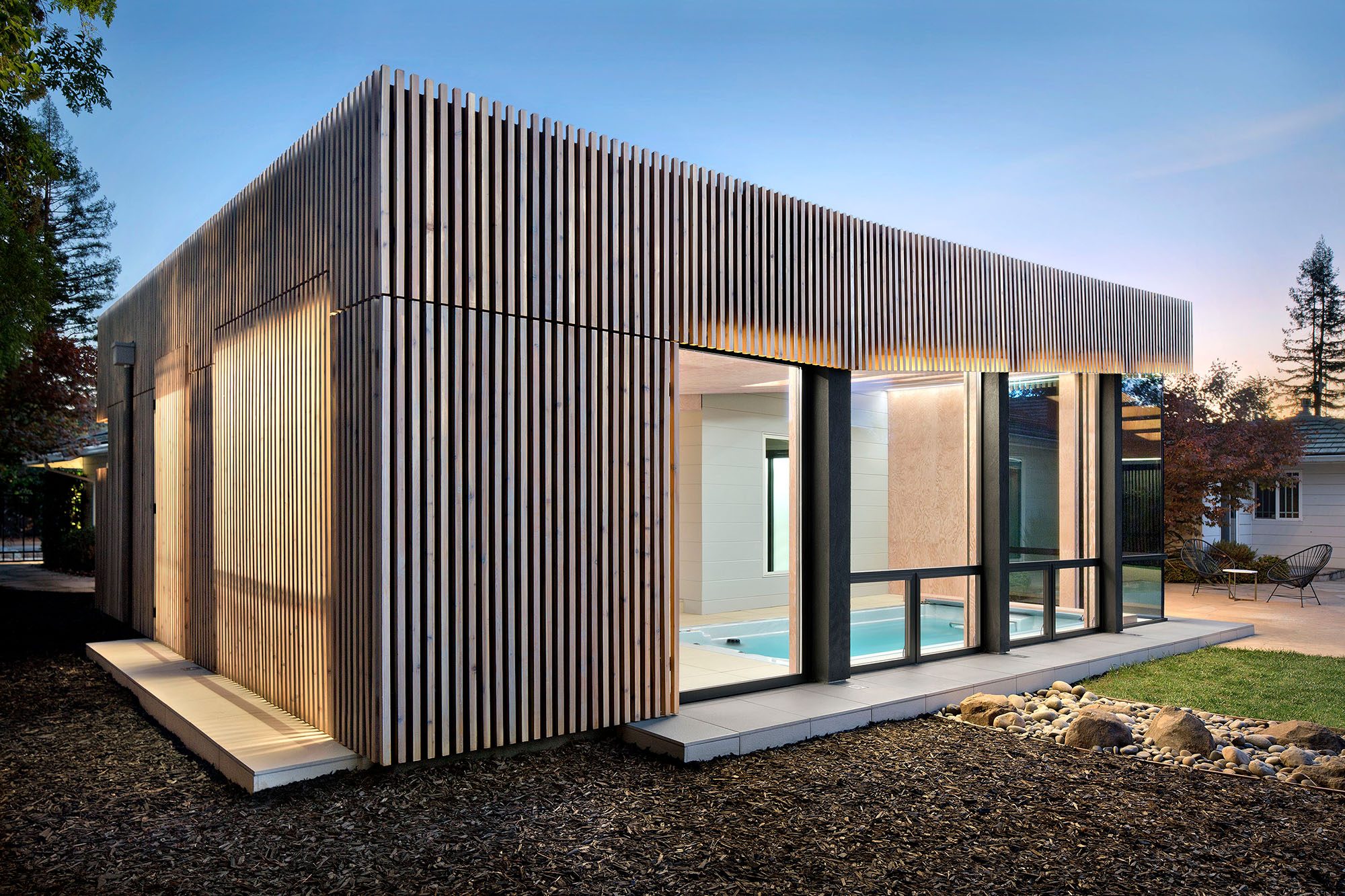 The owners approached Framestudio for an addition to their 1966 ranch-style home that would contain a pool and wellness space, but on one condition: make as few changes to the house and garden as possible. The design concept was inspired by European planning laws that dictate additions to listed historic structures be in the style of the current times, intentionally contrasting with the original. The simple geometry and limited materials give clarity to the new addition. The exterior is punctuated by a cladding of vertical cedar battens, which will age to soft gray over time. Along the neighbor-facing facade, the cladding forms a screen, offering privacy, as well screening out the harsh sun. Plywood animates the interior, creating an energy well-suited for fitness and wellness.