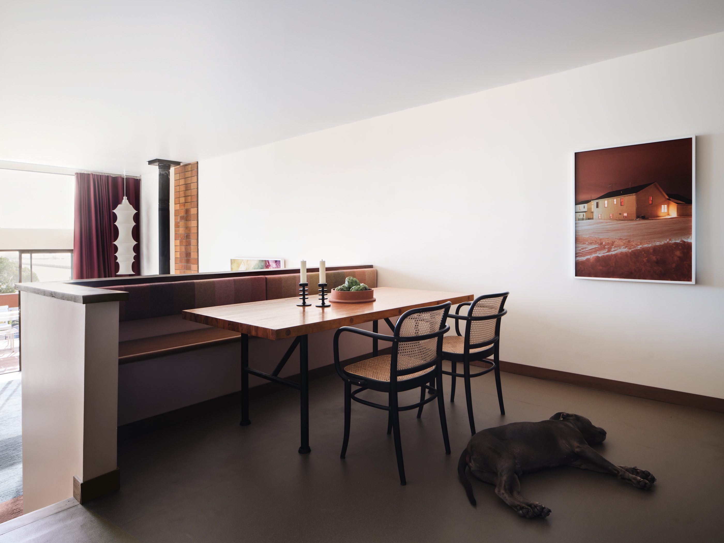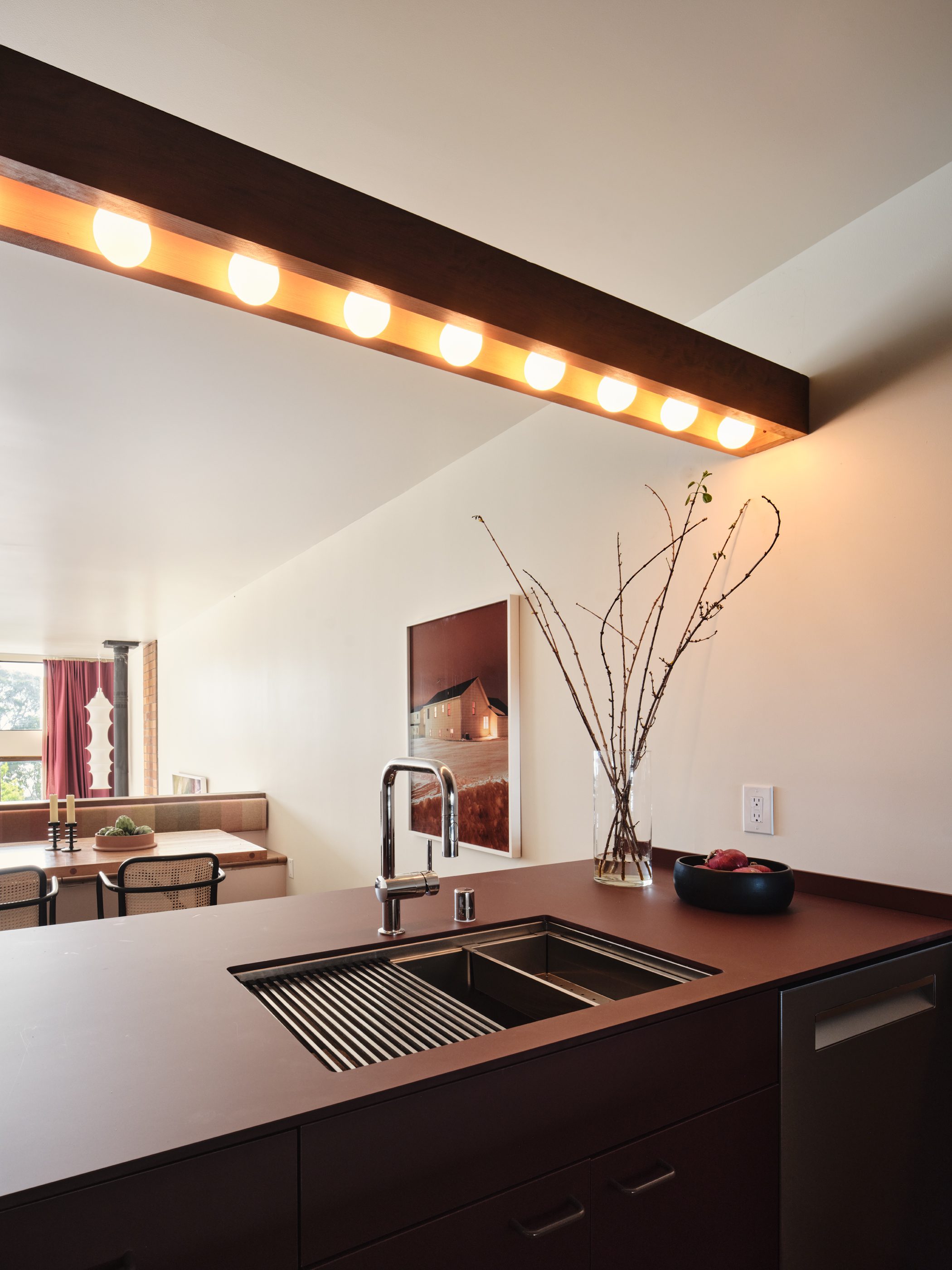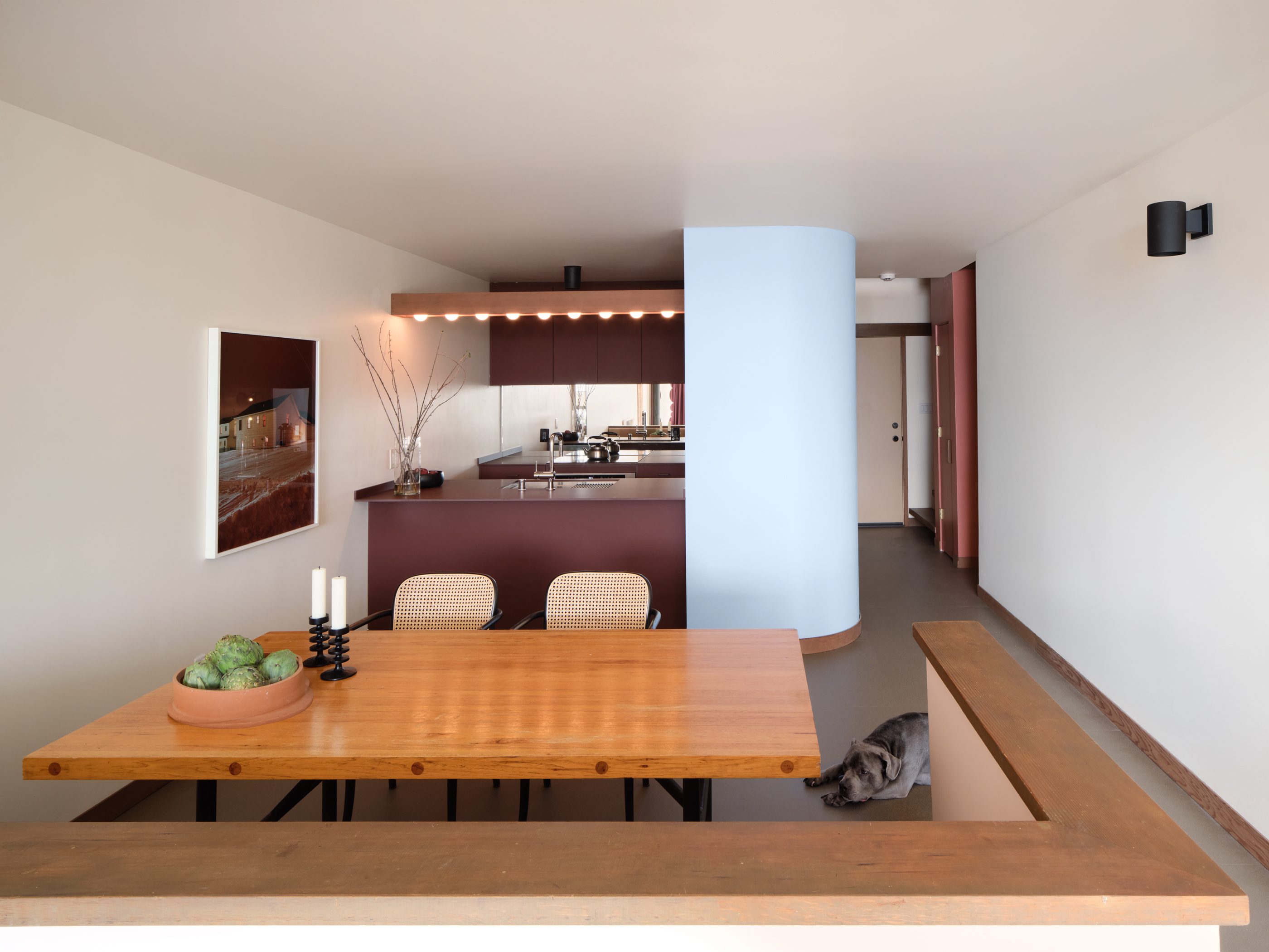 The monochrome custom kitchen was custom designed with Fenix dark red cabinets and countertops. The mirrored backsplash captures the views of the San Franscisco Bay from both the kitchen and from the built-in dining area. A pale blue wall introduces a soft, curvilinear element and reinforces the color palette selected in homage to Le Corbusier.