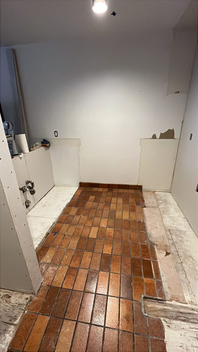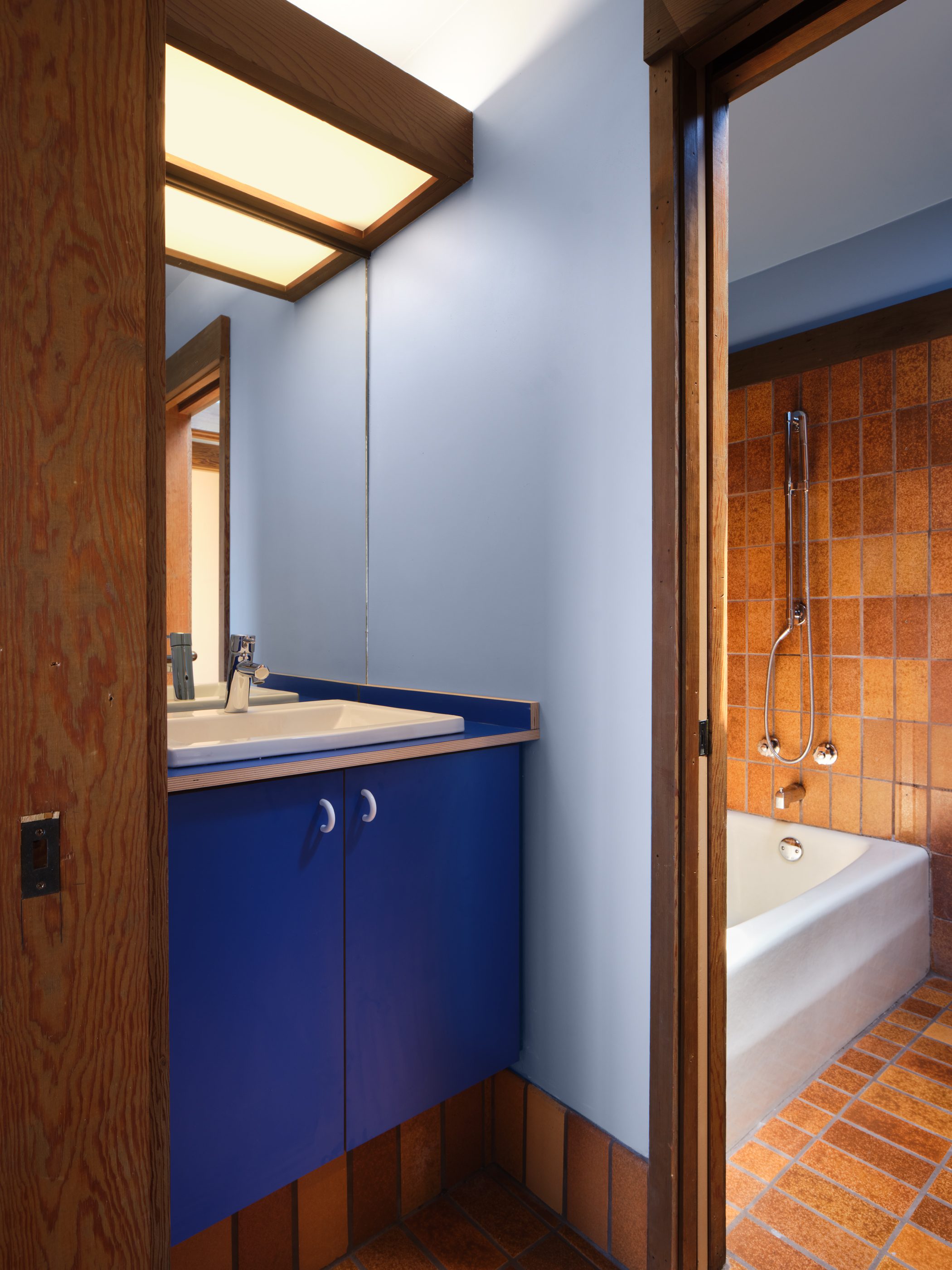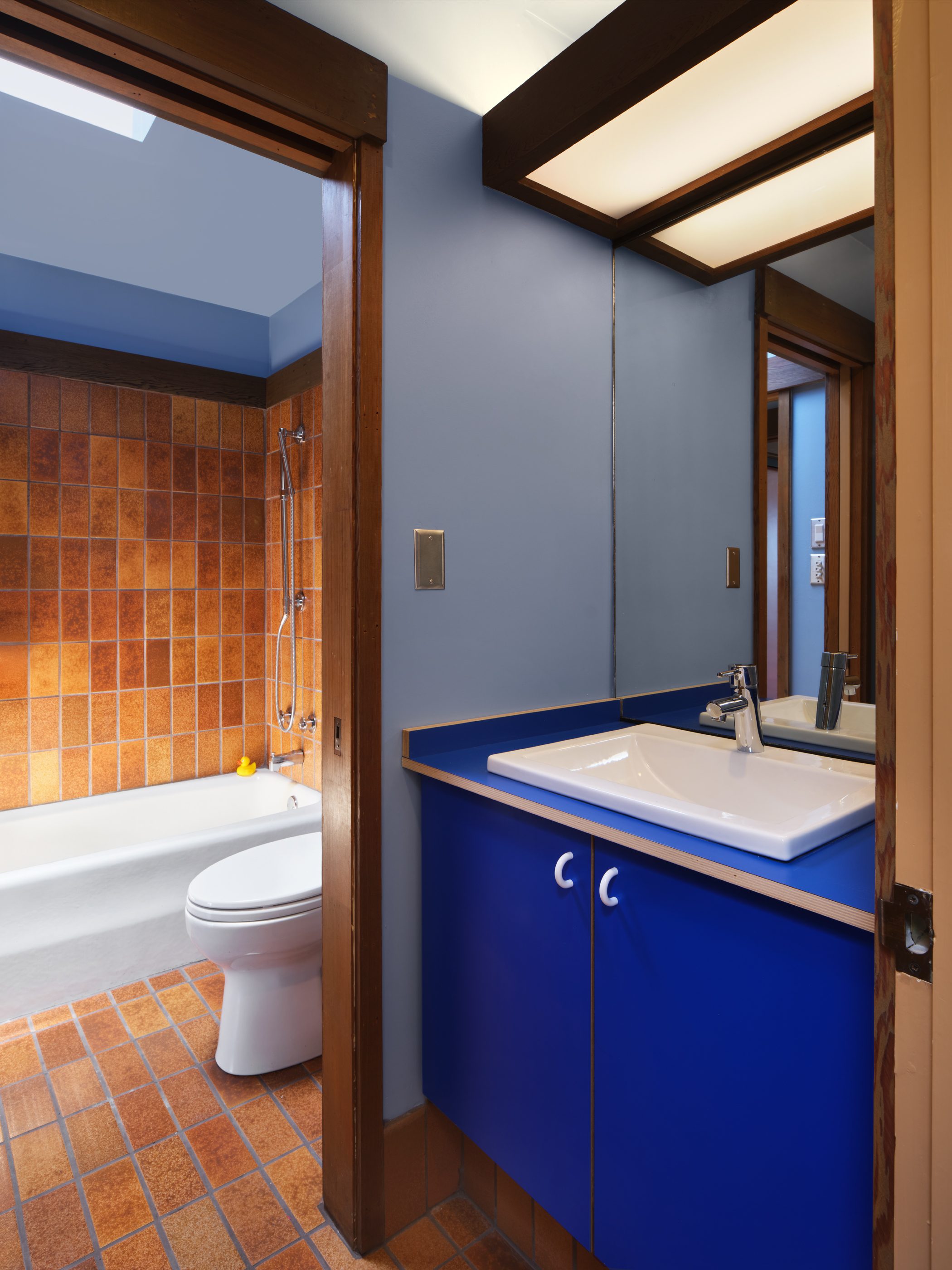 The bathroom is a seamless blend of original design and thoughtful interventions. German tile constrasts with nautical blue cabinetry and Hewi hardware and accessories.